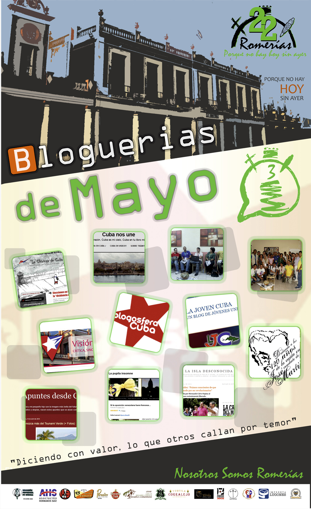 Del 2 al 8 de mayo, la Asociación Hermanos Saíz, las Instituciones Culturales y el Comité Gestor convocan en Holguín, a la XXV Romerías de Mayo. Festival que cada primera semana de mayo convierte a la Ciudad de los Parques en la Capital del Arte Joven. Desde ya invitamos a los amigos de todas las latitudes a que nos acompañen en esta nueva edición del Festival Mundial de las Juventudes Artísticas.